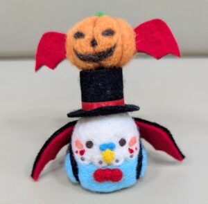 セキセイインコの上には、ちょこんとかぼちゃのおばけくん。